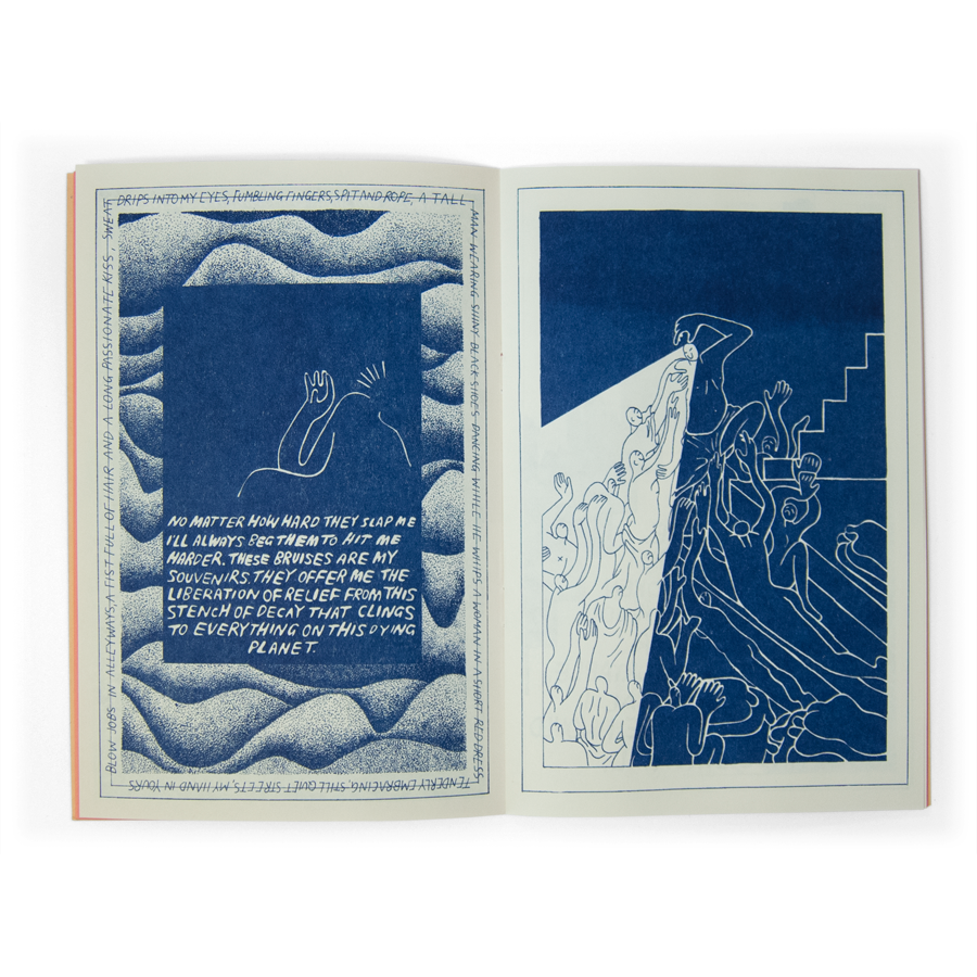 24 pages, Federal Blue ink on Salmon and Cream paper, Risographed, Saddle-stitched