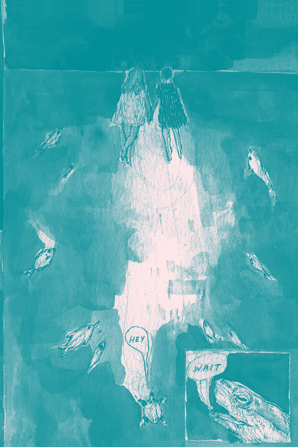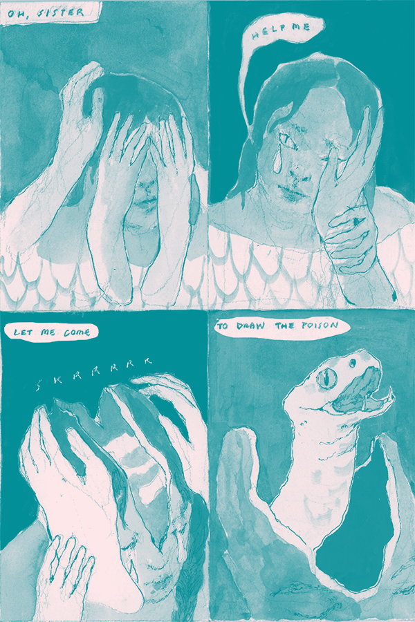 A modern, feminist retelling of the myth of Madame White Snake influenced by the work of Cuban artist Belkis Ayón. The white snake is pulled away from her sibling by an abusive, poisonous stranger who discards her. Her family never forgets her, and she soon returns to the waters that birthed her.