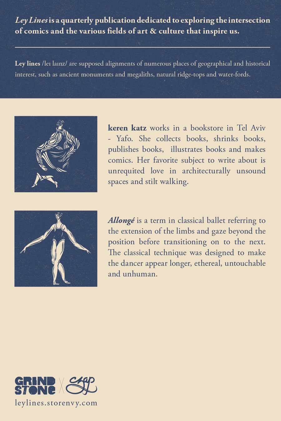 Keren Katz works in a bookstore in Tel Aviv - Yafo. She collects books, shrinks books, publishes books, illustrates books and makes comics. Her favorite subject to write about is unrequited love in architecturally unsound spaces and stilt walking.