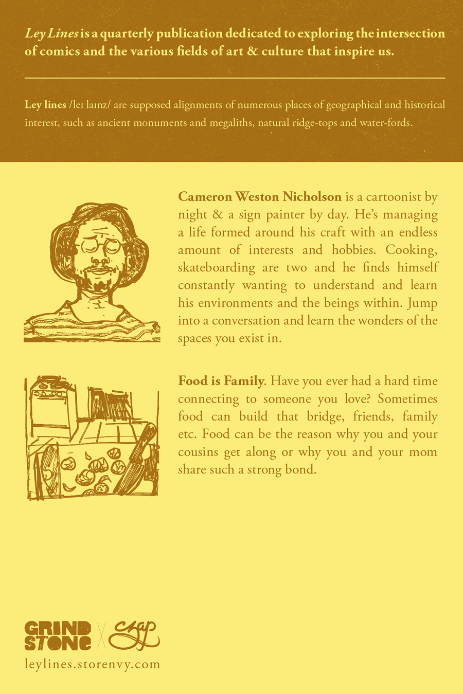 Cameron Weston Nicholson is a cartoonist by night & a sign painter by day. He’s managing a life formed around his craft with an endless amount of interests and hobbies. Cooking, skateboarding are two and he finds himself constantly wanting to understand and learn his environments and the beings within. Jump into a conversation and learn the wonders of the spaces you exist in.